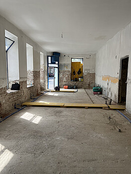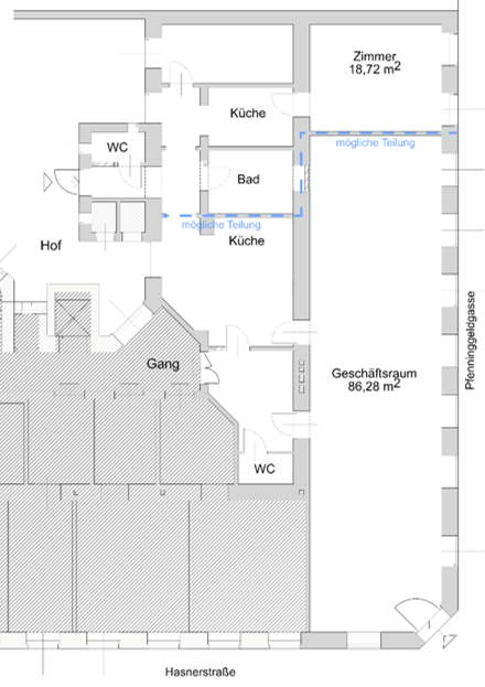 Was: | Geschäftslokal im Erdgeschoss: Das Lokal wird derzeit renoviert, Elektrik, Beleuchtung und Sanitäranlagen. Vorinstallationen für Lüftungsanlage sind vorhanden. Insgesamt ca. 173 m², davon Sanitär/Küche 39 m², zusätzlich 42 m² Keller. Die Fläche ist optional teilbar in 118m² bzw. 55m². |